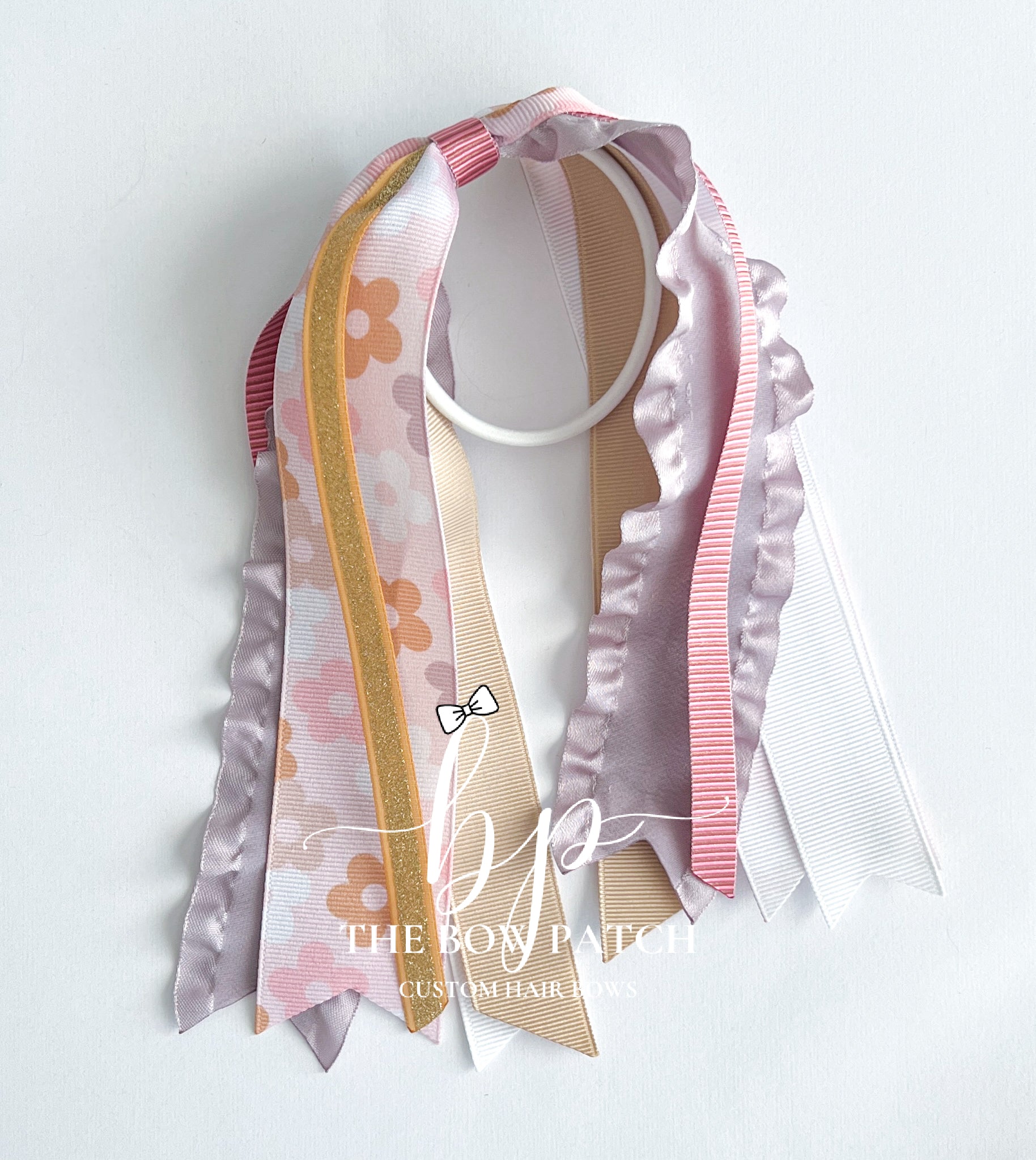 Our pony-os are made with 6 assorted ribbons, hand sewn, and attached to a white ponytail elastic.